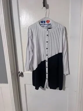 Elegant two-tone tunic with white pleated top and navy lower panel. Full button front and long sleeves. Clean, classic silhouette. Versatile wardrobe piece.