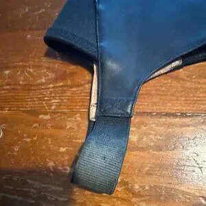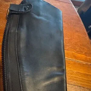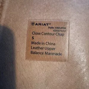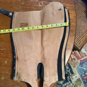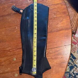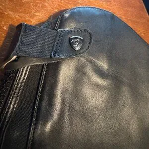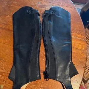 Ariat leather half chaps in black. Full-length side zipper for easy on and off. Elastic ankle and pull tab for secure fit. Smooth leather with minimal detailing. Designed for riding comfort and protection.
