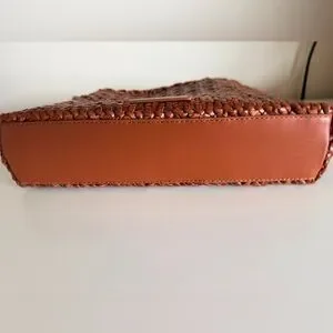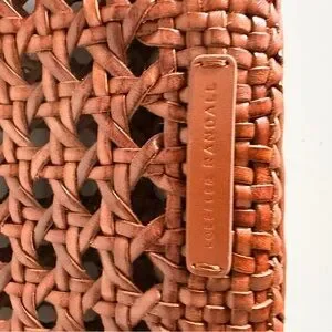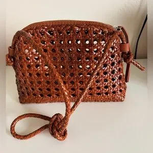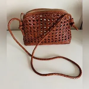 Handcrafted woven leather crossbody in a warm cognac color. Lightweight and versatile, shoulder strap can be adjusted to shorten or lengthen. Secure zip closure and adjustable braided strap. Stylish, textured design that makes a great spring/summer bag!