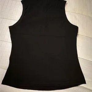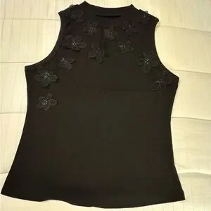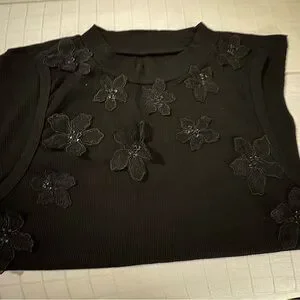 This elegant black top features beautiful 3D floral embellishments, perfect for adding a touch of sophistication to any outfit. Great for layering. Fitted dize L. Sleeveless. P-2-P 28”. Stretchy.