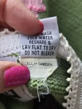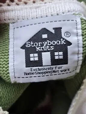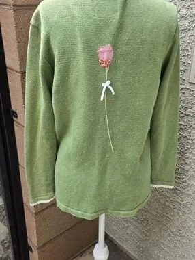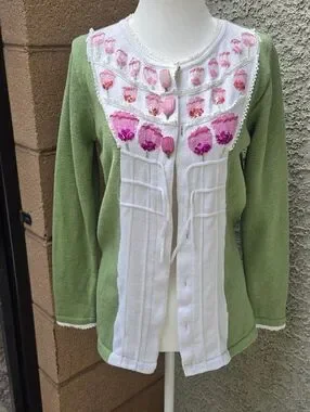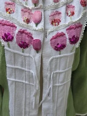 Storybook Knits Green and White Floral Appliqué Women’s Sweater Cardigan Tulips