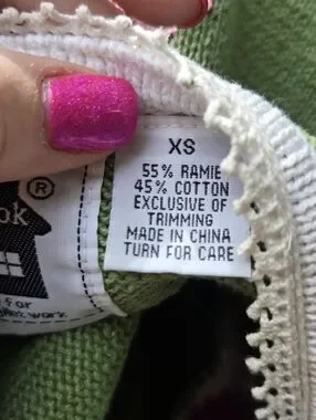Lightweight green sweater cardigan with a white front panel and pink floral appliqué details. Soft knit fabric offers comfortable everyday wear. Decorative pink button accents and textured stitch details create a feminine look. Easy to style over tops or dresses for a polished, casual outfit.