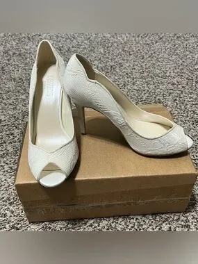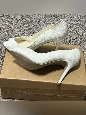 Chic peep-toe stilettos from David’ Bridal.Layla lace peep-toe pumps in Ivory.Ideal for weddings and formal occasions.