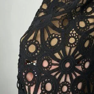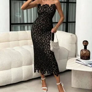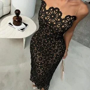This black elegant floral asymmetrical lace midi dress combines a high waist silhouette with a regular fit and delicate arm sleeves for a refined look. A spaghetti‑strap cami neckline highlights the design, while the random‑print lace pattern adds visual interest. A subtle slit at the hem provides graceful movement, making the piece suitable for both daytime events and evening gatherings. The midi length offers a balanced, sophisticated style that pairs effortlessly with heels or flats.