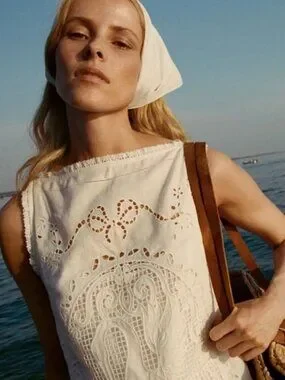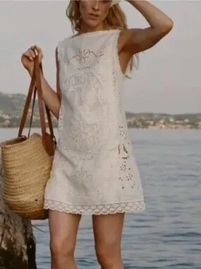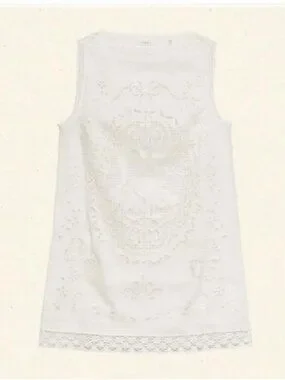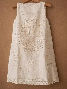 Delicate cream sleeveless dress with intricate cutwork and embroidered detailing. Lightweight and breathable fabric for everyday comfort. Elegant lace trim adds a classic, refined finish. Perfect for special occasions or casual wear.