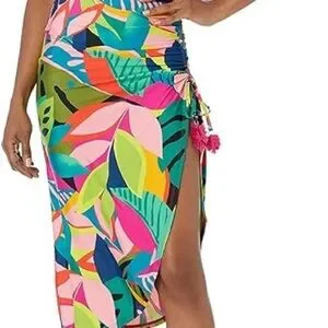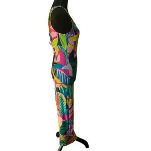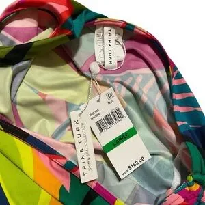 Make a bold statement in this stunning Trina Turk one-shoulder dress, featuring a vibrant tropical print in lush shades of pink, green, blue, and yellow. This figure-flattering dress is made with a stretchy nylon-spandex blend for a comfortable and sleek fit. Perfect for summer parties, vacations, or beachside cocktails. Brand new with tags!