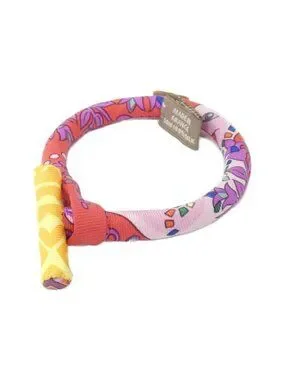 This is an authentic Hermes Brid Bracelet Silk Rouge. The bracelet features a vibrant floral and geometric patterned silk fabric wrapped around a flexible metal core, accented with a circular Hermes logo charm.