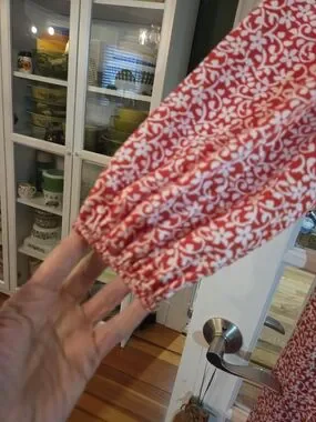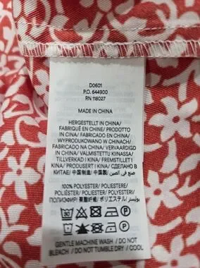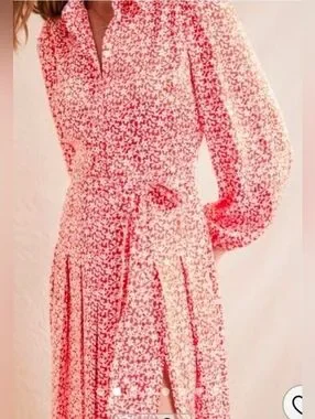 A sateen red floral midi with long sleeves and a V-neck button front. Lightweight fabric with soft pleating for gentle movement. A subtle side slit adds easy, feminine flair. Perfect for daytime events and casual outings.