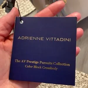 Adrienne Vittadini handbag in a versatile beige and blue color combination. This crossbody shoulder bag features multiple zippered compartments for organized storage and an adjustable strap for comfortable wear. A decorative tassel adds a touch of flair. Perfect for everyday use, travel, or casual outings. (Bin 6)