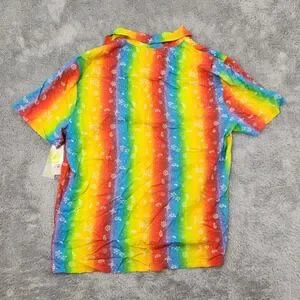 BP. Be Proud collection button-down shirt features a vibrant rainbow vertical stripe pattern with a delicate white paisley and floral overlay. Crafted from lightweight 100% rayon, this short-sleeve top offers a relaxed fit with a single chest pocket and contrasting red buttons. The bold pride-themed design makes it a standout piece for festivals, celebrations, or casual summer wear.