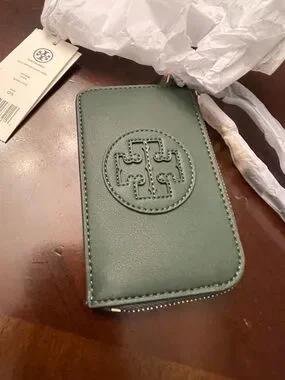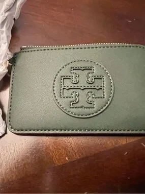 Tory Burch card case, Ella Bio zip card case, green wallet, designer card holder, minimalist wallet, zip card case, luxury accessories, giftable designer, Tory Burch wallet, basil green, NWT