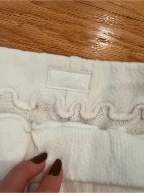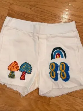 White athletic shorts with drawn rainbow and patch motifs. Elastic waist and relaxed silhouette. Bright, playful embroidered details for a fun look.