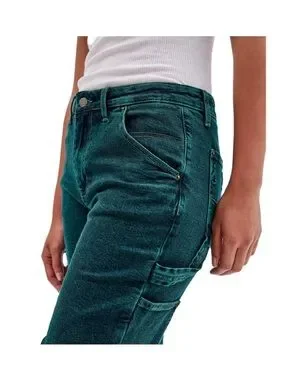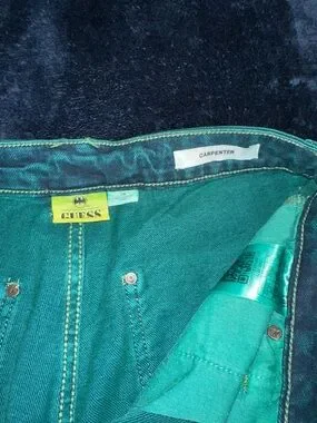 Teal/Green denim carpenter jeans by Guess. Yellow branded logo patch at waistband. Carpenter label and utility stitching details. Vibrant teal color throughout.