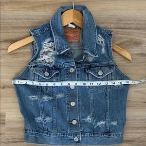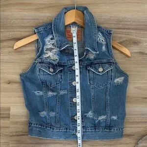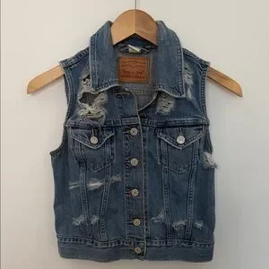denim vest, levi’s vest, women’s denim jacket vest, distressed denim, layering piece, boho style, classic denim