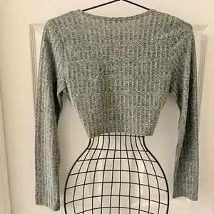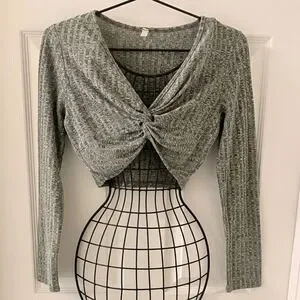 Olive green marl ribbed knit crop top offers a stylish and modern silhouette with its unique twist-front detail and deep V-neckline. Long sleeves and a lightweight, stretchy fabric make it a versatile piece for layering or wearing on its own. The heathered texture adds visual interest to the earthy green tone, while the cropped length pairs perfectly with high-waisted denim or skirts for a contemporary look. No brand tag and check measurements for sizing as fits more like a modern XS-S.