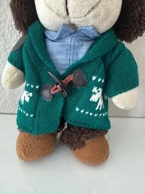 Starbucks plush Bear wearing a green knit cardigan and denim-look shirt. Features a fluffy brown trapper hat and tan/brown feet. Cute embroidered face and toggle clasp detail. Great collectible plush from Starbucks.
