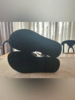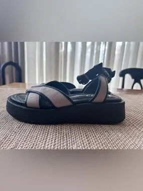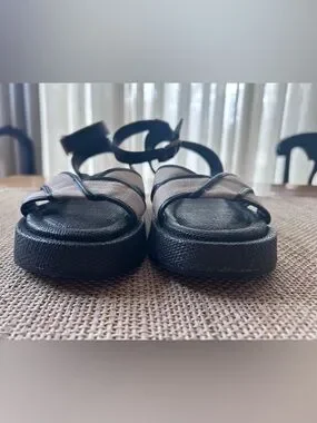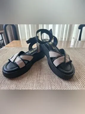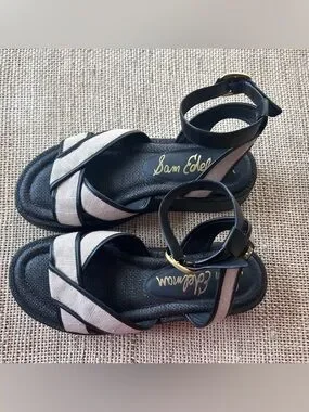 Sam Edelman Nylie Black Leather&Natural Linen Platform Ankle Strap Sandal.Size 8
