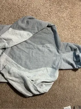 Soft pullover hoodie with curved wave panel detailing. Subtle two-tone gray design. Long sleeves and relaxed fit. Cozy fleece-like fabric. Minimal ALO branding at hem.