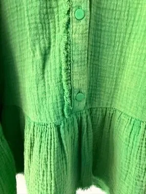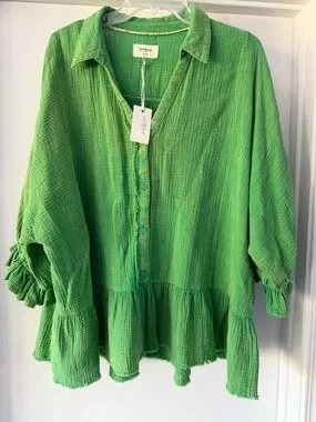 Umgee peasant-style tunic in bright green. Button-front placket with a relaxed collar. Ruffled hem and gathered sleeves add feminine detail. Lightweight textured fabric for easy layering.