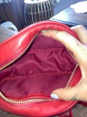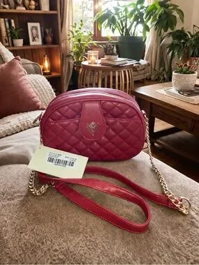 Stylish quilted pink crossbody bag with a gold-tone chain strap. Compact oval silhouette with top zip closure and subtle logo detail. Perfect for hands-free convenience and everyday outings. Vibrant RED color adds a feminine pop to any outfit.