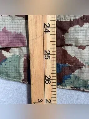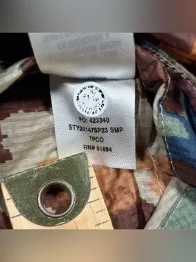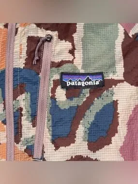 The Patagonia Houdini Jacket is a women's small lightweight windbreaker ideal for active occasions in the summer, fall, or spring. Made with durable nylon outer shell material and lined with nylon, this mid-length jacket features a full zip closure, long sleeves, and a hood for added protection. With a stylish camouflage pattern and logo accents, this jacket offers both functionality and fashion for outdoor activities. The materials are sourced from Vietnam, and the jacket is designed by the reputable brand Patagonia, known for their commitment to sustainable practices.