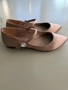 Elegant pointed-toe Mary Jane flats by Pedro Garcia. Soft nude pink satin with scalloped edge. Single strap with a sparkly buckle. Feminine and refined look for day or dress wear.