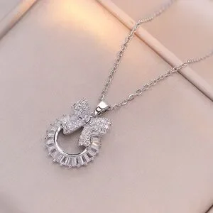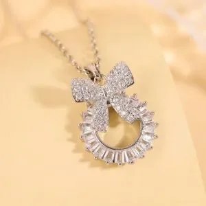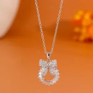 Sophisticated silver-tone pendant necklace with a sparkling bow and crystal halo. Features clear crystals for a radiant, timeless look. Perfect for adding refined sparkle to any outfit.