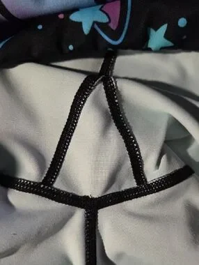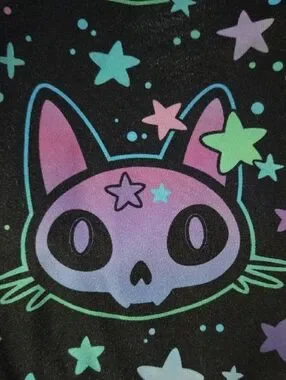 Black leggings with repeating pastel skull cat and stars. Bright neon-style pink, purple, and aqua motifs. Soft stretch fabric for easy movement. Playful print adds a cute, edgy touch.
