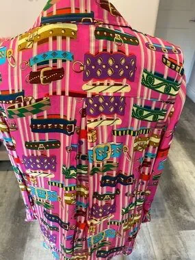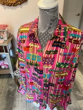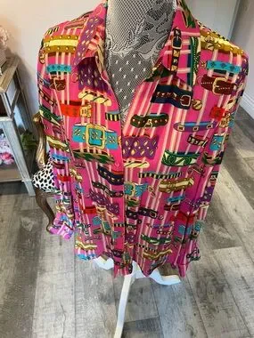 Vibrant hot pink silk blouse with bold belt and hardware motifs. Multicolored print includes green, purple, gold and cream accents. Smooth, luxe drape and eye-catching design. Versatile statement top for styling.