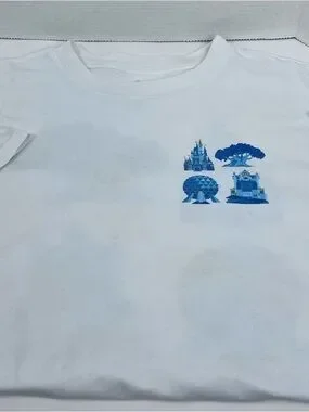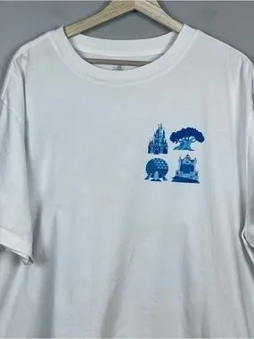 Disney Parks Men's 4 Park ICON Graphic Print Organic Cotton Tee Shirt Size XXL. Great Condition with minor discoloration (See Photos for Details). Men's Disney Parks 4-Park ICON Double Sided Graphic Print T-Shirt with Cinderella's Castle, Spaceship Earth, Tower of Terror and The Tree of Life.