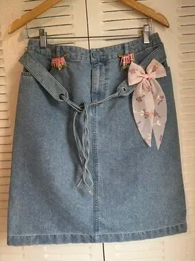 Upcycled Denim Mini Skirt Size 10 – Handmade Charm Details & Floral Bow🌸