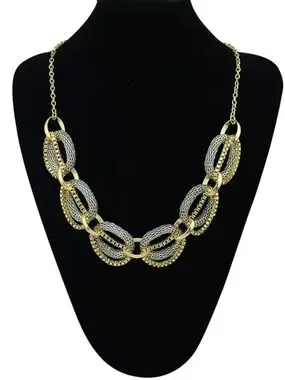 Statement chain with alternating polished gold and textured silver links. Bold design for a standout look. Pairs easily with mixed-metal jewelry.