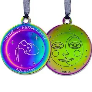 This gleaming, iridescent metal Christmas tree decoration features the Aquarius zodiac sign with an intertwined sun and moon celestial design on the back.