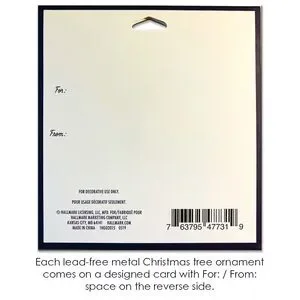 Each lead-free metal Christmas tree ornament comes on a designed card with For: / From: space on the reverse side.