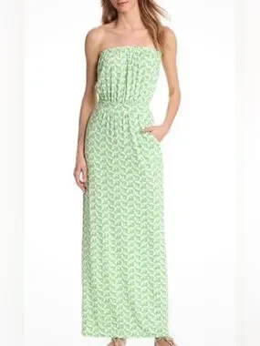This Lilly Pulitzer "Buzzworthy" Strapless Maxi Dress is a quintessential resort-wear staple. Featuring a vibrant green and white bee print, this dress offers a flattering silhouette with its cinched waistband and comfortable stretch fabric. The inclusion of pockets makes it as functional as it is stylish—perfect for summer parties, vacations, or a casual day out.