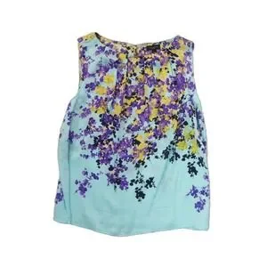 Excellent Condition, looks like new! Talbots Petites sleeveless silk blouse features a vibrant floral print in shades of purple and yellow against a refreshing aqua blue background. This elegant top is crafted from 100% silk, offering a luxurious feel and a beautiful drape. The design includes a sophisticated pleated neckline and a button closure at the back, making it a versatile piece for both professional and casual settings.