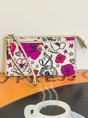Vintage Limited Edition Coach Poppy Kyra Floral Print Wristlet Wallet, featuring a vibrant pink and purple floral design on a cream background with metallic gold leather trim.