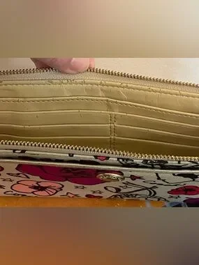 Features: all-over floral "pop art" print with fuchsia, light pink, and purple flowers accented by stars and hearts on a cream-colored background. Zip-top closure and a "dog-leash" style clip on the wrist strap, allowing it to be attached to the inside of a larger bag or worn alone.