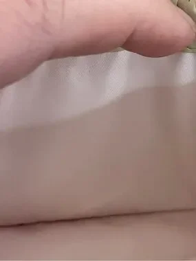 • Materials: Sateen fabric or "Pop C Canvas" with metallic gold leather trim and gold-toned hardware. Cream leather interior. Light pink fabric pockets.