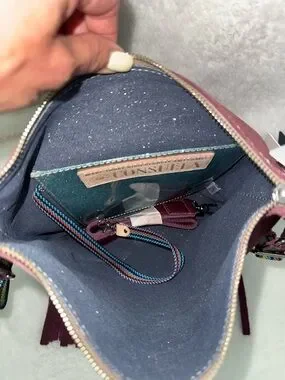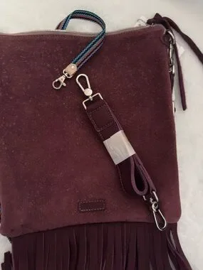 Consuela’s Stylish burgundy leather fringe crossbody bag with a colorful striped strap. Soft suede-like finish and playful fringe detail add boho charm. Lightweight and versatile for everyday wear.