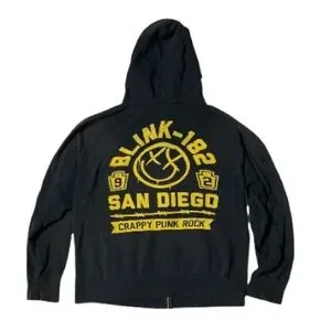 Black zip hoodie featuring a bold yellow band logo and 'Crappy Punk Rock' graphic. Comfortable cotton-blend fabric with full zip and hood for layered styling. Classic black color with eye-catching yellow print for casual, everyday wear.