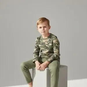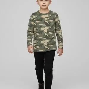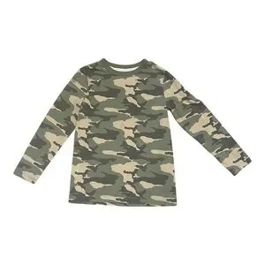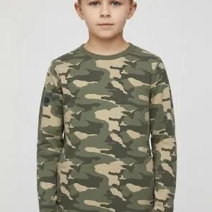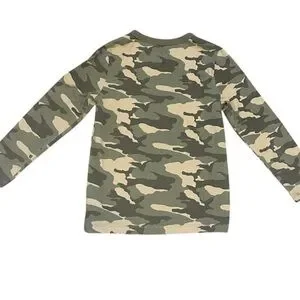 Comfortable long sleeve tee with green and brown camouflage pattern. Ideal for casual outings.