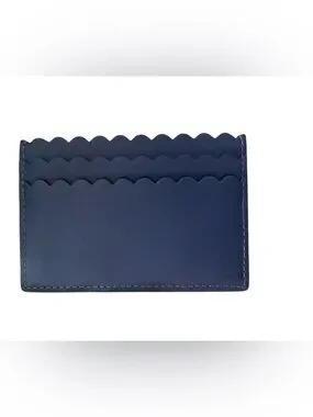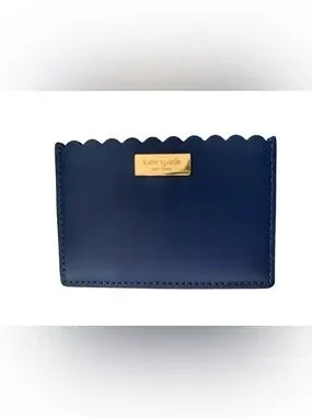 This item is a navy blue leather card holder by Kate Spade New York, specifically from the Maple Court collection. It features the brand's signature scalloped top edge and a polished gold-tone logo plate on the front. Material: Smooth leather with a matching interior lining.
