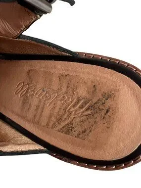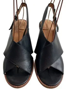 Madewell The Ruthie sandals, black leather, criss cross straps, wrap around ankle strap, buckle closure, 3.25" block heel, US women's 9, preowned and shows wear on the soles, discoloration on the lining, scuffs on the heels - see photos