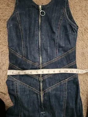 Sleeveless denim jumpsuit with a deep V neckline. Front zipper closure with ring pull. Fitted through the waist with seam detailing. Flared wide-leg silhouette. Stretch denim for easy movement.