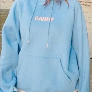 Soft light blue pullover hoodie with front kangaroo pocket. Center chest 'DANDY' logo in contrasting pale pink. Drawstring hood and relaxed fit. Casual and cozy staple.