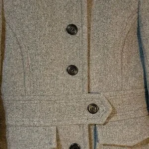 J. Crew gray wool blend peacoat with a flattering belted waist and dual front pockets. Embellished with decorative buttons on the cuffs and back. The interior lining features a vibrant striped pattern. Perfect for everyday wear or a stylish evening out.