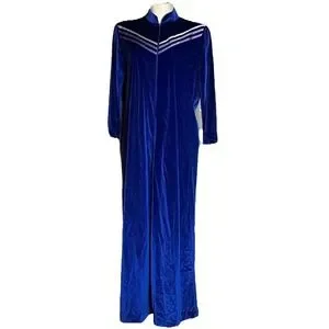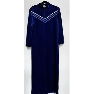 Vtg Blue Velour House Coat Robe M Zip Long Sleeves Cozy Modest Full Length Long