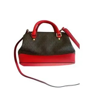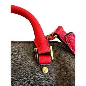 Michael Kors Signature Monogram Dome Satchel Crossbody Bag Red Leather Trim