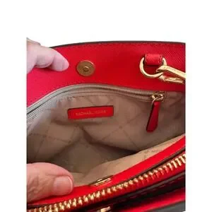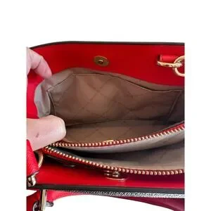 Keywords: Michael Kors, monogram, dome satchel, crossbody, red leather, gold logo, designer handbag, luxury purse, signature print, structured bag, evening bag, day to night, travel accessory